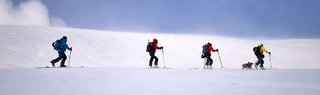 Whilst Al clothed Dougal in the dog equivalent of a hard shell jacket, we gathered round and decided what to do. Carry on into the rising wind and worsening weather with the summit still two km away or turn back and enjoy the descent whilst the light still allowed us to see what we were skiing. An easy decision to make!